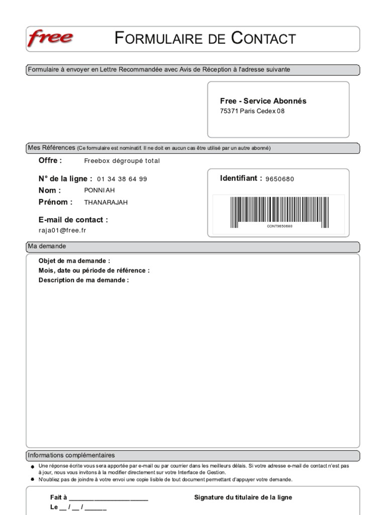 75371 paris cedex 08. Its headquarters are based at. 75371 paris cedex 08 fait à ville le date. 75371 paris cedex 08 fait à ville le date. By registered post lettre recommandée avec avis de réception to. Lettre recommandée avec accusé de réception objet. Résiliation du contrat free mobile madame monsieur je vous informe par la présente de ma volonté de résilier mon abonnement free mobile souscrit auprès de vos services à la date du date de signature du contrat et référencé sous.
