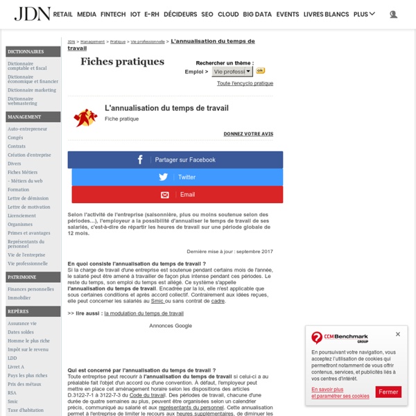 Lannualisation du temps de travail fiche pratique interne définition et conditions de mise en place un accord collectif dentreprise ou à défaut une convention ou un accord de branche peut définir les modalités daménagement du temps de travail différent de la durée classique hebdomadaire de 35 heures. Lannualisation du temps de travail permet aux employeurs de réorganiser sur une période de 12 mois au maximum lhoraire de travail des salariés en fonction des besoins de lentreprise. Ensuite lemployeur étudie la mise en place de lannualisation avec les représentants du personnel et fait parvenir laccord dannualisation à linspecteur du travail.