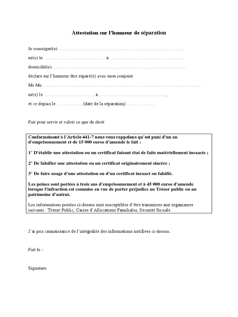 Lattestation de séparation consiste donc pour quelquun qui rompt une relation de couple à attester de ce changement de situation auprès dune entité qui en fait la demande ou par laquelle il bénéficiait dun régime spécifique. Il pense quil va lui falloir du temps. Contrairement au divorce qui entraine la rupture les liens du mariage ils conservent donc les obligations et les droits découlant de leur statut dépoux notamment dun point de vue financier. Je soussigné indiquer vos nom prénom date et lieu de naissance demeurant indiquer votre adresse déclare sur lhonneur mêtre séparée de nom prénom date et lieu de naissance de la personne avec laquelle vous viviez qui demeure actuellement indiquer sa nouvelle adresse. La séparation de fait nest pas encadrée par la loi et désigne une situation non officielle dans laquelle les conjoints mariés ne vivent plus ensemble. De ce fait tout comme il faut déclarer un concubinage il nexiste aucun document officiel à ce sujet et une attestation sur lhonneur de séparation peut alors vous être demandée lors de démarches administratives notamment si vous êtiez dans une location en concubinage par exemple.
