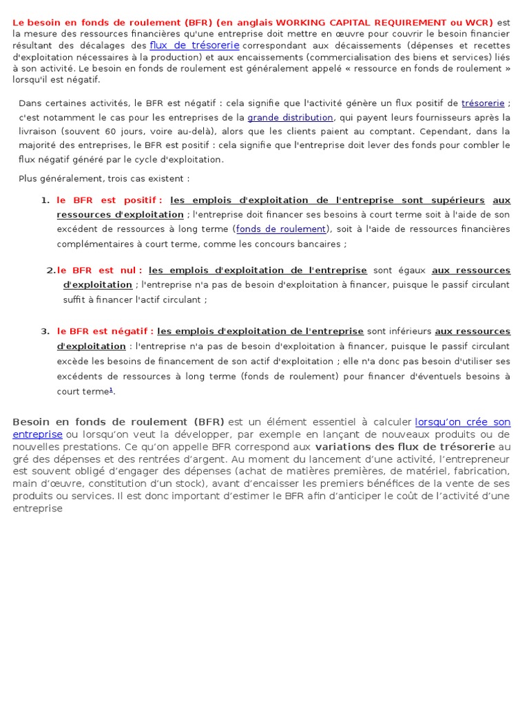 Le besoin en fonds de roulement bfr correspond au décalage entre les décaissements et les encaissements. Dans certaines entreprises le bfr peut être négatif. Fonds de roulement positif. Elle nécessite donc de la trésorerie pour décaisser achats avant de pouvoir encaisser ventes cest là quintervient le besoin en fonds de roulement bfr. Il est un ratio qui évalue la trésorerie dont lentreprise a besoin en permanence. Oui tout à fait lorsque votre bfr est négatif il constitue une ressource dailleurs on ne parle pas de besoin en fonds de roulement mais de ressource en fonds de roulement.