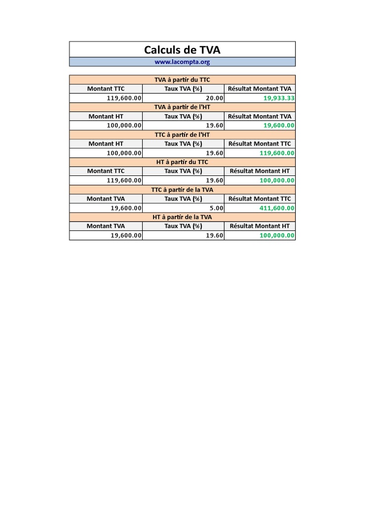 Si vous avez un prix ht et que vous voulez calculer rapidement le prix ttc il vous suffit de multiplier le prix ht par 1196 pour une tva à 196 ou par exemple multiplier par 1055 pour une tva à 55. Conversion ht ttc pour les pays francophones autres que la france. Notre outil propose les taux de tva de france belgique et suisse et il est à jour pour la nouvelle tva française à partir de janvier 2014. Vous trouverez un autre exemple grâce à limage ci dessous. Calculer le montant ht se fait assez simplement à partir de la tva ou du montant ttc. Ttc ht ht x tva 100 comment calculer le ht à partir du ttc.