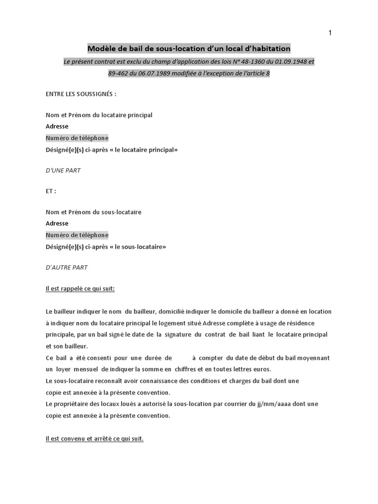 Lensemble du processus peut prendre moins de 10 minutes. Ce contrat de location type en pdf gratuit et à jour 2020 doit être imprimé puis rempli au moment de la signature du bail avec le locataire. En cas de contrat de sous location dun bail dhabitation quil sagisse dun contrat de sous location meublée ou vide non meublée il faudra se référer à la loi du 6 juillet 1989 et particulièrement à son article 8 qui précise que le locataire ne peut sous louer le logement sauf avec laccord écrit du bailleur. En principe la sous location nest pas autorisée il faut donc une autorisation donnée par le bailleur principal personne qui loue lhabitation au preneur.