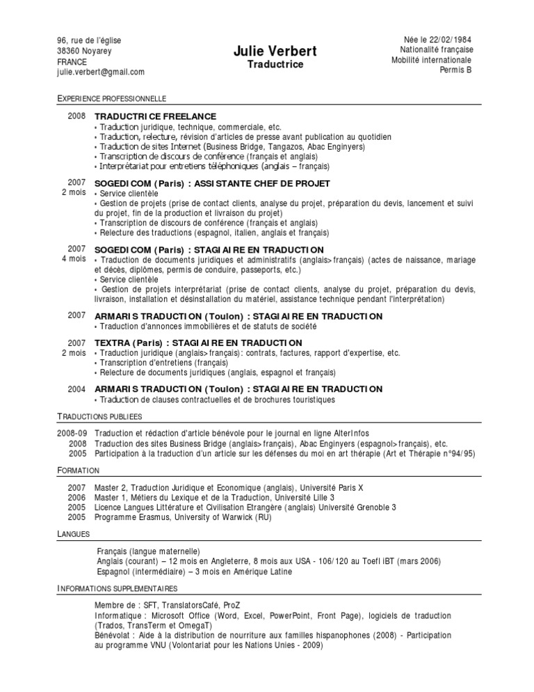 En moyenne un cv en anglais contient entre 300 et 1000 mots. Dautant plus nombreuses seront les entreprises qui te demanderont de leur transmettre un cv traduit en anglais ou de pouvoir leur envoyer la traduction de celui ci. Paul maubert jai fait une demande de traduction de cv en anglais pour un délai de 24h qui a été parfaitement tenu. Exemple de cv anglais. Nous proposons huit modèles de cv différents qui sont disponibles en quatre couleurs différentes. De très nombreux exemples de phrases traduites contenant curriculum vitae dictionnaire anglais français et moteur de recherche de traductions anglaises.