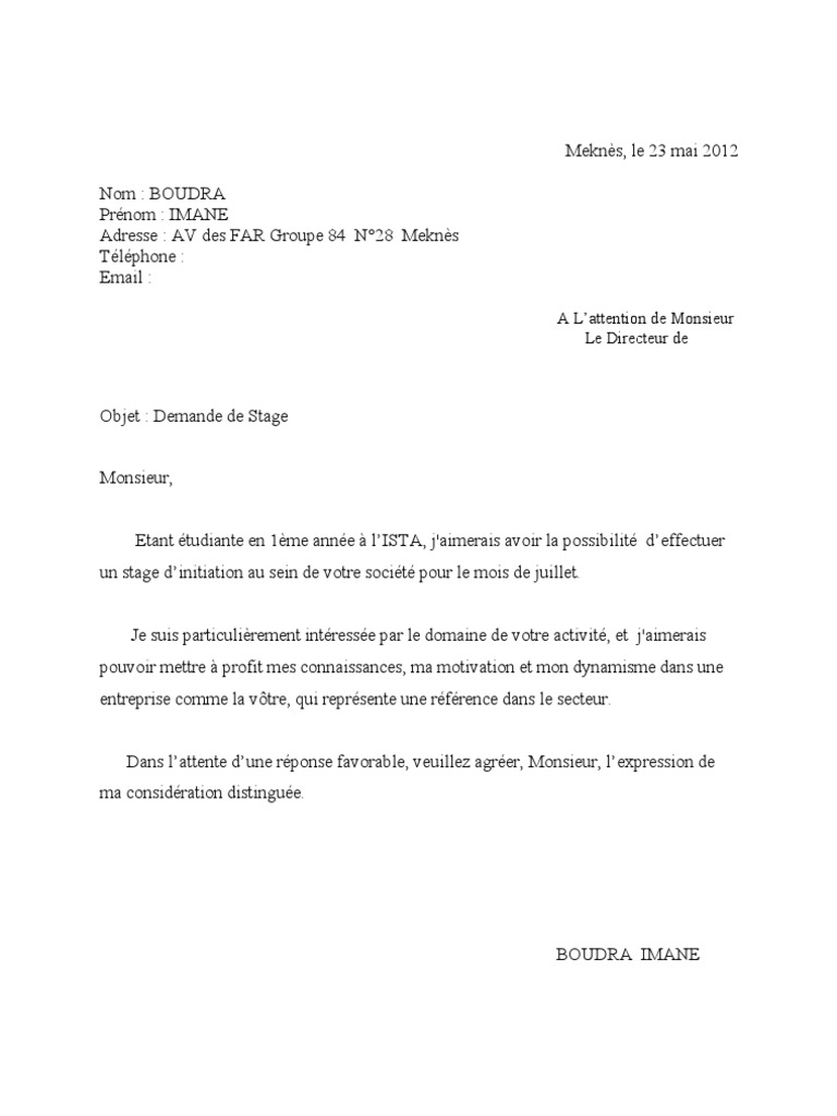 Exemple demande de stage. Je me permets de vous contacter suite à une offre de stage postée sur le site nom du site le date de publication de lannonce concernant un stage désignation du stage. Formation de ville je souhaitera is faire mon stage dans votre entreprise. Adaptée à loffre de stage sil y en a une. Formelle et correctement mise en page. Demande de stage. Madamemonsieur jai lhonneur de vous demander de bien vouloir maccorder un stage conventionné dune durée de durée du stage au sein de votre entreprise à compter du date de début jusquau date de fin.