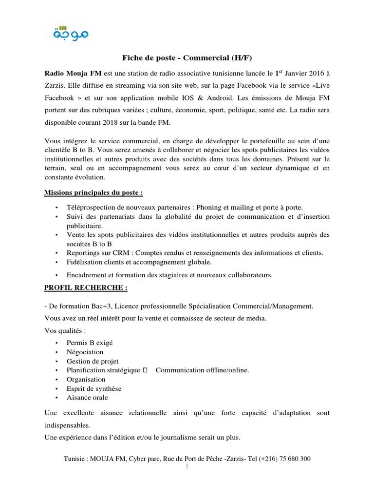 Cette fiche de poste commercial est à télécharger au format word. Il peut être en contact direct avec lutilisateur ou avoir à faire à des intermédiaires. Le technico commercial est garant du développement du chiffre daffaires dans les domaines industriels ou de services à lindustrie. Description la fiche de poste commercial. Elle peut ensuite être modifiée en fonction de vos besoins vous pouvez changer le logo les couleurs les images ou bien ajuster le contenu à votre convenance. Le commercial terrain doit effectuer des déplacements quotidiens en véhicule pour visiter ses clients entreprises ou particuliers sur un périmètre géographique pré déterminé.