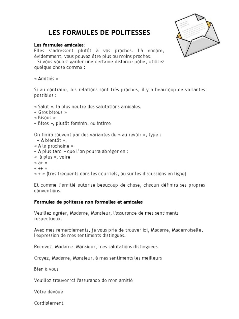 Formule de politesse amicale. On rencontre aussi de nombreuses formules de politesse amicales très codifiées dans les correspondances par mail et par lettre dans lunivers du français businessnous vous proposons dans cet article une liste de formules de politesse amicales les plus utilisées en langue française. Pour un chef détat écrite par un homme veuillez accepter monsieur lexpression de nos sentiments distingués. Il nest pas toujours facile de trouver la bonne formule de politesse pour conclure un message un courrier un lettre ou en encore un email. Lorsquon sadresse à un supérieur hiérarchique ou à un client la formule de politesse doit être formelle et exprime le respect que lon a de son interlocuteur. Pour une jeune fille écrites par une femme acceptez mademoiselle mes cordiales salutations. Lettre formelle lettre informelle lettre amicale lettre formelle.