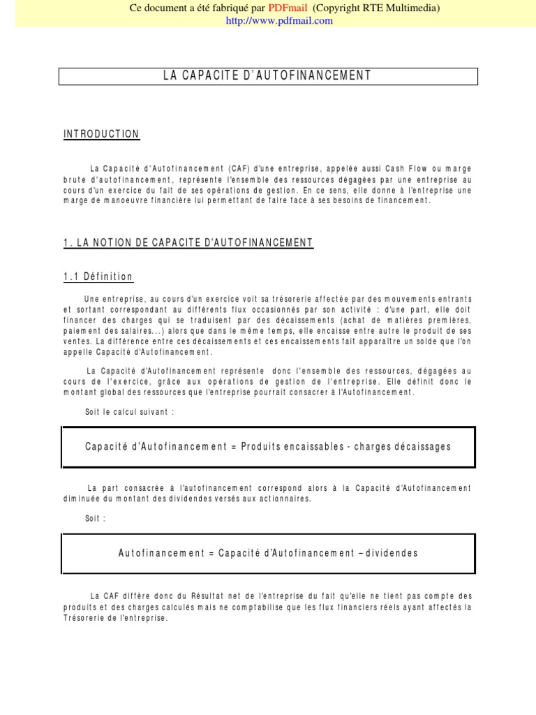 La capacit d autofinancement. On retrouve cet indicateur dans les tableaux de financement à côté des autres leviers de financement que sont les augmentations de capital les emprunts ou bien les cessions dactif. La capacité dautofinancement est laptitude dune entreprise à dégager des liquidités provenant de ses ressources internes en vue de financer ses besoins dexploitation et de développement. La capacité dautofinancement ou caf désigne lensemble des ressources brutes restant à une entreprise à la fin dun exercice. Elle permet à lentreprise de se développer en assumant elle même ses besoins dinvestissement mais peut être également utilisée à des fins dépargne de remboursement demprunt ou pour rémunérer les actionnaires sous forme de dividendes. Le calcul de la capacité dautofinancement vous permet de déterminer le montant de la trésorerie potentielle qui est généré par lentreprise dans le cadre de son activité. Interpréter et utiliser la capacité dautofinancement.