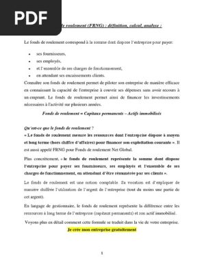 Le fonds de roulement correspond à lencaisse et aux autres actifs dont une entreprise dispose après avoir comptabilisé tout son passif courantcest lun des six principaux calculs utilisés pour déterminer la liquidité à court terme dune entreprise cest à dire sa capacité à payer ses factures à échéance. Quand il sagit dun capital argent bien immobilier fonds sécrit toujours avec un s. Au cours de lélaboration dun business plan de création dactivité vous devez effectivement estimer votre besoin en fonds de roulement prévisionnel tel quil serait au lancement de votre activité bfr car ce dernier doit être financé par un emprunt à court terme par exemple un apport en compte courant par un découvert bancaire ou par lexcédent du fond de roulement. Concrètement le fonds de roulement est ce qui reste à lentreprise comme ressources stables capitaux propres et emprunts après avoir financé les immobilisations machines matériels etc. Le fonds de roulement est défini comme lexcédent de capitaux stables par rapport aux emplois durables utilisé pour financer une partie des actifs circulants. Ce décalage crée un besoin temporaire qui doit être financé ou une ressource financière lorsquil est négatif.