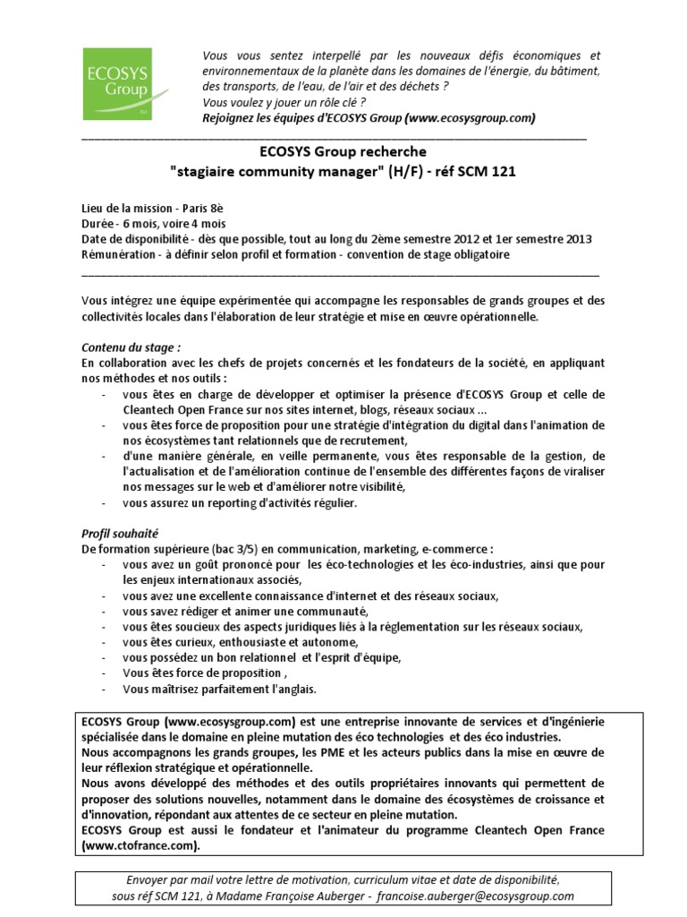 Le community manager doit également savoir faire preuve de discernement et bon sens afin déviter de créer un bad buzz qui nuirait à le réputation de son employeur. Lettre de motivation stage community manager 17 décembre 2017 600 lettre de motivation stage community manager inspirez vous de cette lettre de motivation et des autres liens menant sur les lettres de motivation du même type. Trouver ou adapter une accroche cv de notre liste des candidats ayant postulé pour un stage community manager. Lettre de motivation pour un poste de manager la lettre de motivation pour un poste de manager ne doit pas être trop longue au risque de ne pas être lue. En tant quambassadeur dune marque dune personnalité ou dune structure le community manager occupe un poste stratégique dans le domaine du marketing et de la communication. Je suis très intéressé par le poste de community manager que vous proposez.