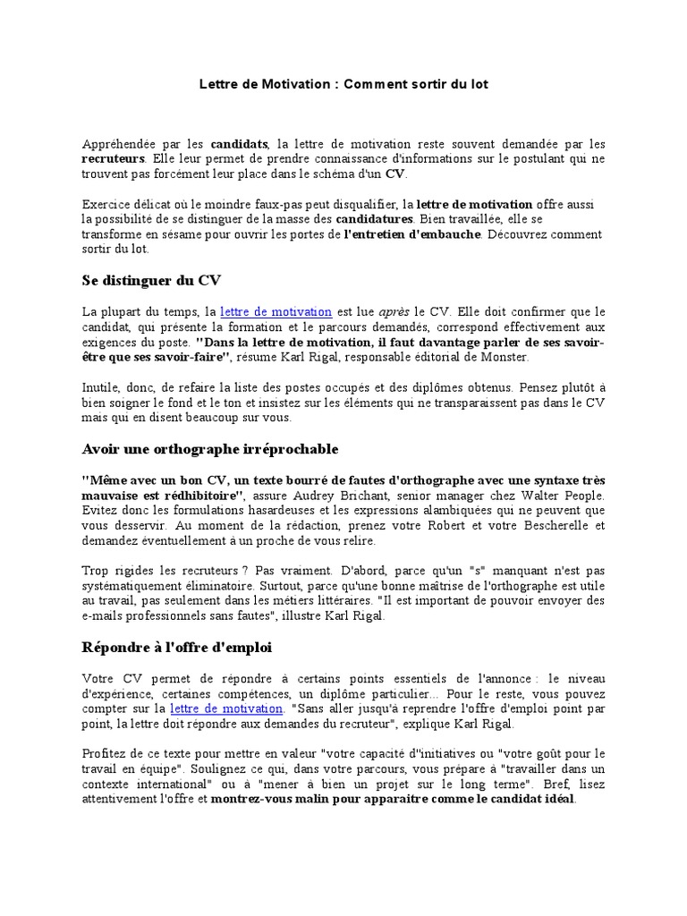 Bien plus quune formule de politesse la lettre de motivation donne une voix un visage à votre cvun candidat avec un bon cv mais une lettre bâclée peut voir sa candidature tomber à leau. Lettre de motivation. Rédiger sa lettre de motivation. Si le recruteur nest pas tenté par votre lettre il ne lira même pas votre cv. Une bonne lettre de motivation est primordiale pour une demande demploi efficace.