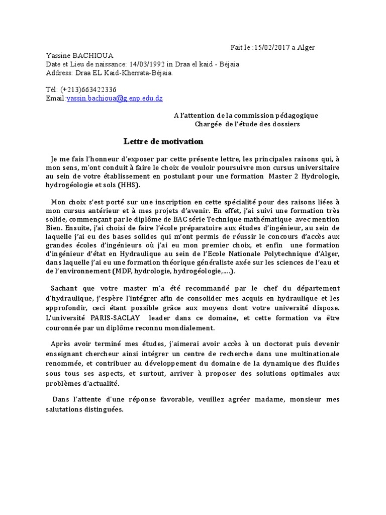 Dans ce cadre je souhaite intégrer votre université à la rentrée prochaine pour y suivre une formation de nom de la formation et vous prie de bien vouloir trouver ci joint mon dossier dadmission sil y a lieu. Pour transformer votre modèle de lettre lettre de motivation pour un master en pdf utilisez le logiciel de traitement de texte gratuit libreoffice ou openoffice qui permet de faire directement la conversion de word à pdf. Ou celui ci pour une lettre de motivation université en général. Prochainement diplômée de nom du diplôme jai pour projet de poursuivre mes études dans le domaine de préciser afin de devenir préciser. Voici un guide étape par étape pour écrire une excellente lettre de motivation pour master à luniversité. Comment faire une lettre de motivation pour master 1 et 2.