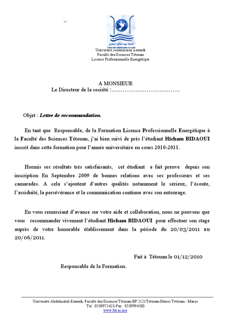 Lettre de recommandation pour un étudiant en master. Lettre de recommandation dun professeur pour son étudiant 0 par docutexte une étudiante vient de vous demander de lui écrire une lettre de recommandation car il ou elle est à la recherche dun emploi et une telle lettre serait bénéfique dans ses recherches. Madame monsieur professeur de préciser à préciser établissement jaimerais appuyer la candidature de nom prénom pour préciser. Exemples de lettre de recommandation à télécharger gratuitement avec word. Vous serez très certainement amené à demander à un professeur de vous fournir une lettre de recommandationcette démarche vous sera indispensable pour constituer un dossier solide et sérieux. Après tout travail stage ou autre expérience professionnelle il arrive souvent que lintéressé demande à son employeur une lettre de recommandation.