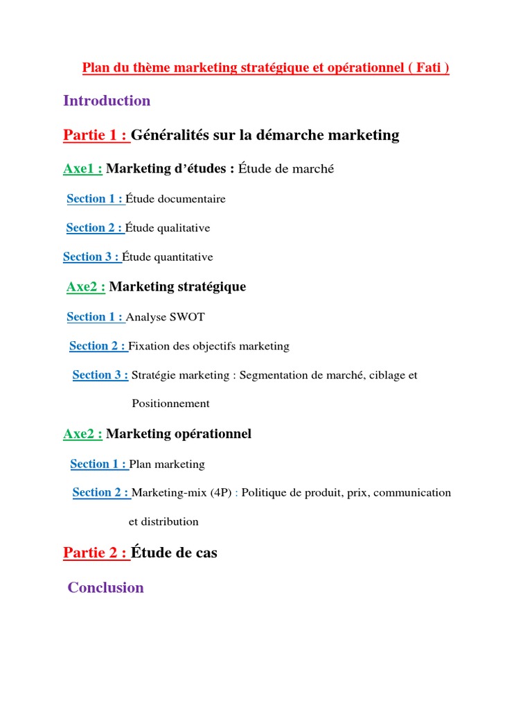 Comparé au corps humain le marketing stratégique représente la tête de lhomme en vertu de son cerveau en commandement et le marketing opérationnel représente ses membres main pieds en exécution. Ils sont indissociables et parfaitement complémentaires. Le marketing opérationnel peut se segmenter en quatre points clés appelés aussi marketing mix. Létape des études constitue entre autres le marketing stratégique première phase et létape action fait partie du marketing opérationnel second phase. A vous de jouer. Puis il nous explique le rôle du marketing stratégique gardien du temple et de la vision à long terme 35 ans versus le marketing opérationnel et tactique animateurs supports des ventes.