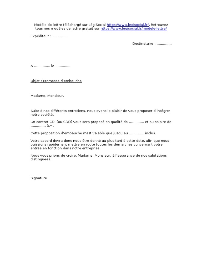 Voici les règles de forme à connaitre ainsi quun exemple de lettre gratuit dont vous une lettre de promesse dembauche est donc une formalité particulièrement importante quil convient de ne. Nous vous proposons donc un contrat à durée indéterminée. Promesse dembauche modèle de lettre conseils pratiques droits des salariés. Modele promesse dembauche pdf gratuit meilleures réponses. Ce modèle de promesse dembauche engage lentreprise et doit être envoyée au futur salarié en recommandé avec accusé de réception. La validité dune promesse dembauche nest pas conditionnée par sa forme écrite.
