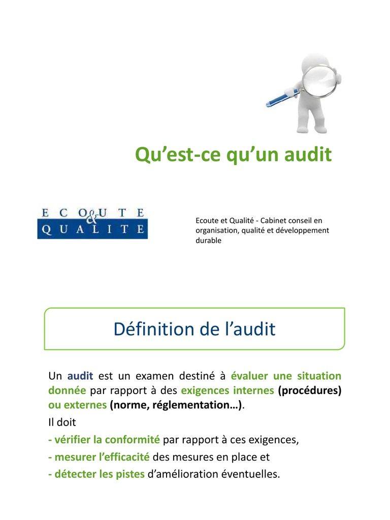 11 laudit 111 définition de laudit selon le petit robert le vocable audit tient son étymologie du latin audi tus entendu dont le sens est saisi. Quest ce quun auditeur ica ou auditeur irca un auditeur ica ou aussi nommé auditeur irca est un individu détenant une qualification dauditeur externe. Audit quest ce quun audit. Laudit énergétique est un état des lieux détaillé des performances énergétiques de votre habitation effectué par un auditeur reconnu par bruxelles environnement. Audit quest ce quun audit.