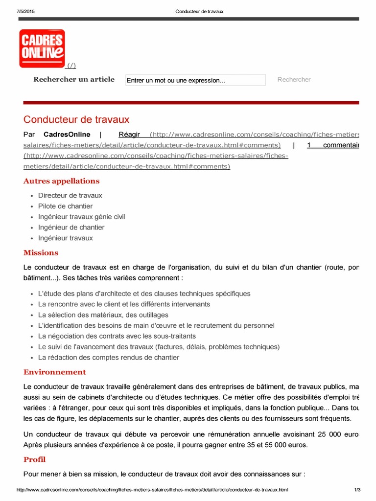 Il est responsable de la qualité des travaux effectués de la tenue des délais et du respect du budget. Avec loutil de rémunération de neuvoo vous pouvez rechercher et comparer des milliers de salaires dans votre région. Le salaire un conducteur de travaux débutant gagne 30 000 annuel brut. Le conducteur de travaux la conductrice de travaux est une personne de terrain et ses activités varient beaucoup selon la taille du chantier et la structure de lentrepriseil dépend directement du chef dentreprise ou du directeur des travaux.