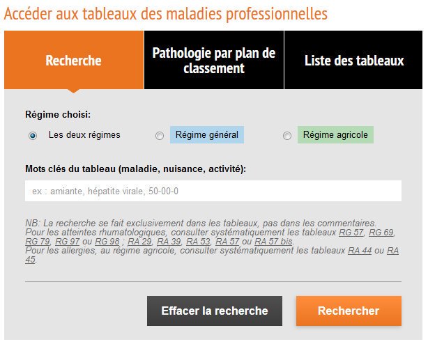 Ce sont les tableaux des maladies professionnelles qui recensent les affections reconnues comme telles. Ces données concernent de nombreuses maladies tels que les cancers les intoxications les affections respiratoires ou cutanées etc.
