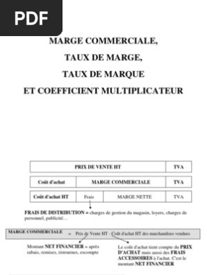 Le calcul dune marge permet de connaître le bénéfice qui sera tirer dune vente et donc de lactivité de lentreprise. Ce ratio est essentiel pour le dirigeant dune entreprise afin de mieux connaître sa performance. Son but est de déterminer la rentabilité créée par la vente dun produit ainsi que de connaitre la part de la marge brute dans le prix versé par le client ou encore de définir un prix de vente hors taxes adéquat sachant le prix hors taxes des. Le taux de marque commerciale est égal à 30. Si je calcule bien jai un taux de marge de 128 et mais un taux de marque de 56. Le taux de marge fait référence au pourcentage de gain ou de perte dune entreprise pour un produit ou un service par rapport à son coût dachat ou de production.